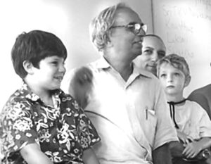 I was remembering how, in the summer of 2003, my teacher Desikachar’s family joined my family, friends and colleagues for a small ceremony to help inaugurate our new studio. Taken on that day, this photo shows me and my teacher and my middle and youngest sons, Jai (8) and Sasha (3). Afterwards at Vatan, our favorite Indian restaurant, Desikachar mischievously offered $20.00 to Jai if he would eat one of the hot chili peppers on the table. Jai was game to try it, but I intervened.